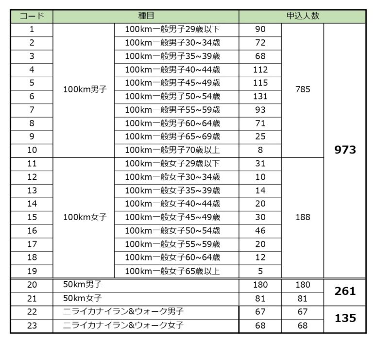 第8回沖縄100Kウルトラマラソンの種目・年代別エントリー者数を公開いたします。ご参考ください。