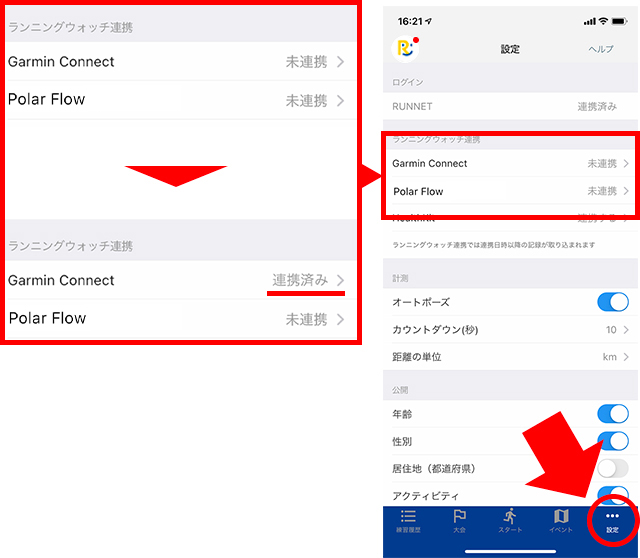 1. 画面右下の[設定]をタップ。[Garmin Connect]または[Polar Flow]をタップしてください。